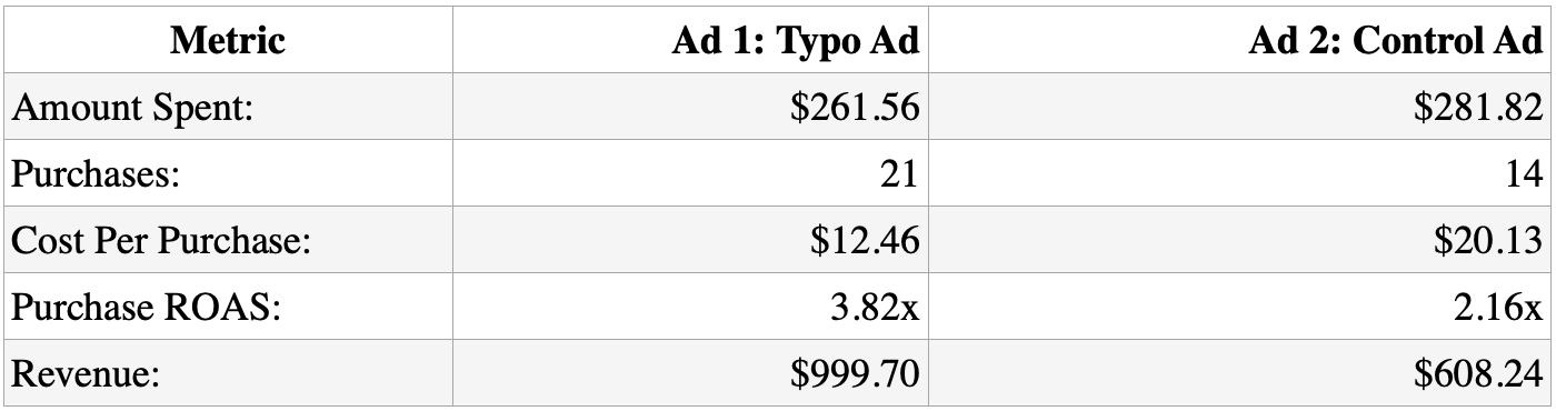 But that typo was deliberate, strategic—and it doubled our ROAS from 1.9x to 3.82x practically overnight.